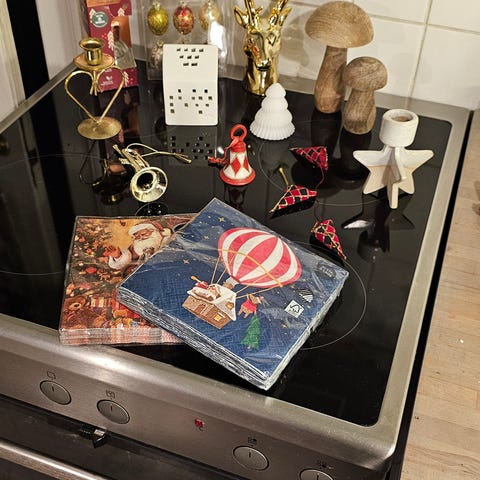 Tre stk julepynt fra Kahler og to keramik juletræ fra Søstrene Grene