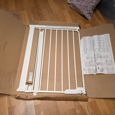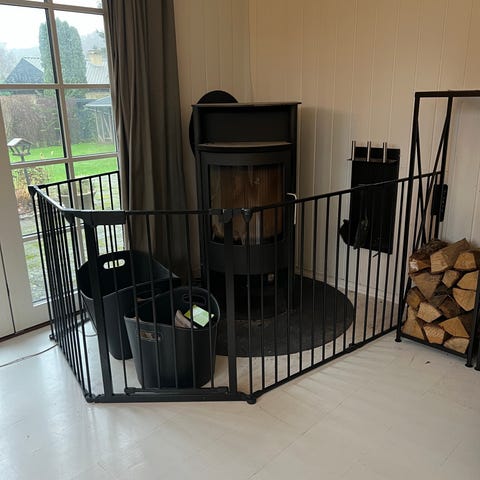 Sort metal børnegitter eller hunde gitter til brændeovn, kan klappes sammen og stå bag brændeovnen når det ikke bruges, afhentes 3120