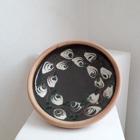 Måler ca 32 x 28,5 x 10 cm. Kan ikke helt tyde signering i bunden