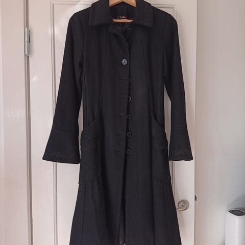 Frakke, str. 42, Erika Cavallini, Sort, brun, metal, 80% bomuld 20% polyamid, Næsten som ny, Nypris 3.800 kr. Ufattelig lækker frakke uden foer / uforet. Kan bruges både ude og inde som forårsfrakke / forårsjakke / festfrakke / selskabsfrakke / selskabsjakke / overgangsjakke / indejakke / indefrakke.