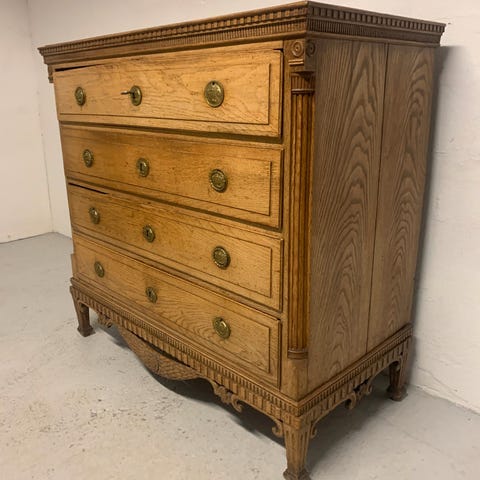 Antik kommode fremstillet i egetræ med fem skuffer. Kommoden har messingbeslag og dekorative detaljer på hjørnerne. Designet med lodrette riller langs øverste kant. Passer til opbevaring i stuer eller soveværelser.