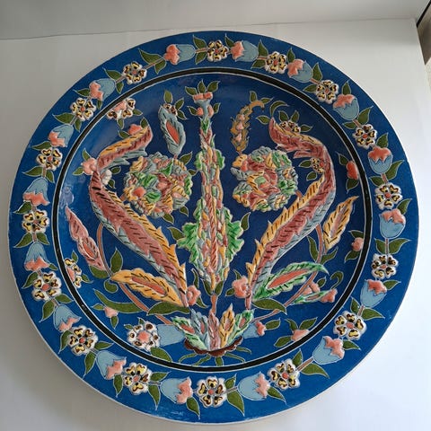 Dette er en dekorativ tallerken med et farverigt påfuglemotiv. Tallerkenen har en diameter på 21,5 cm. Designet præsenterer en blå påfugl med orange og røde detaljer, omgivet af blomster og blade. Den har en guld kant, og bagsiden indikerer, at den er håndlavet i Grækenland af Keramik Koz. Tallerkenen er udstyret med en metalholder til ophængning.