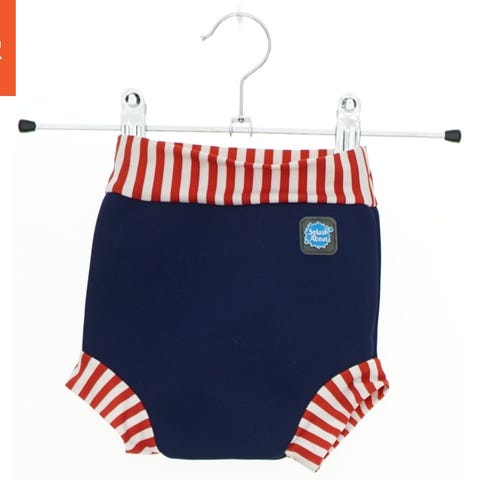 Baby svømmeblebukser i rosa og blå farver med et dyremønster.