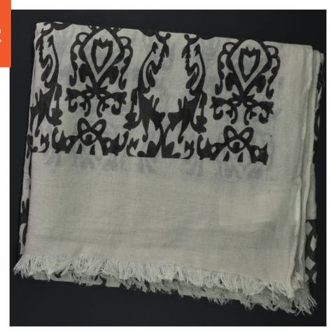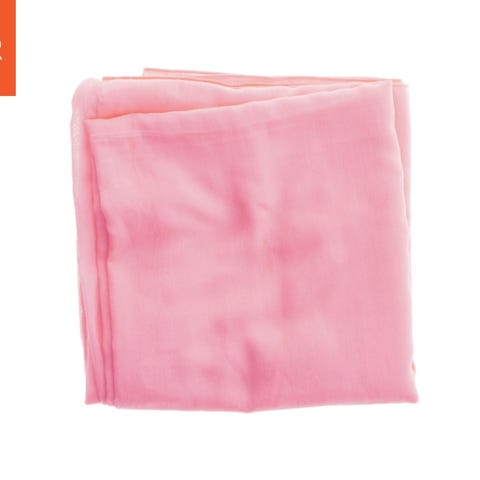 Dette er et tørklæde, der måler 110x110 cm. Stoffet er løst vævet og har en lys orange farve.