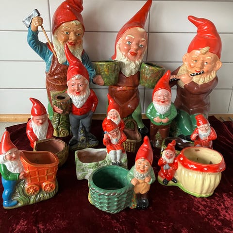Gamle nissefigurer fra 1950’erne i rød og grå farve. Figurenes beklædning består af rødt tøj med sorte bælter og grå bukser. Velegnet som dekoration i juletiden. Ansigter lavet af celluid.
