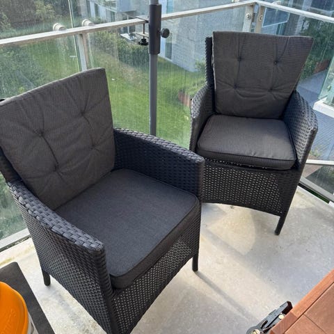 Stolene er velegnede til udendørs brug og har et robust design med fletmateriale.