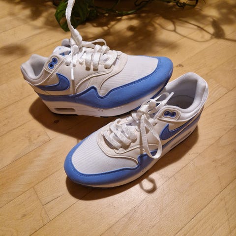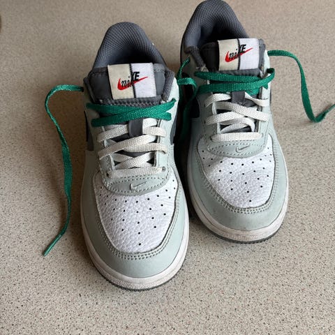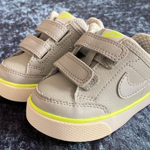 Nike børnesko til unisex i størrelse 19. Skoene har en kombination af mørkeblå og røde farver med velcrolukning. Materialet er designet til børns komfort og støtte.