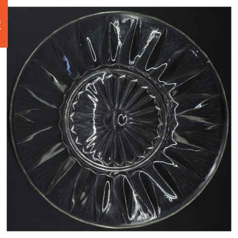 Rundt glasfad med en diameter på 31 cm. Fadet har et mønstret design med riller og en kant med små geometriske former. Det klare glas giver et elegant og tidløst udseende, hvilket gør det velegnet til servering eller som dekoration.