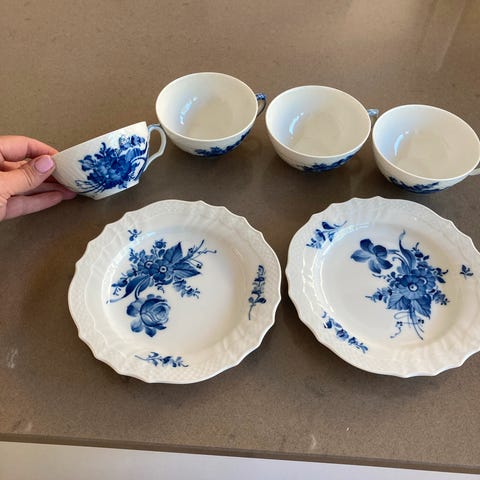 Sættet består af to tekopper med matchende underkopper, i design “ blå flettet blomst “ fra Royal Copenhagen Kopperne har en diameter på 10 cm, og underkopperne måler 15 cm i diameter. str.