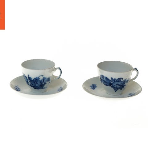2 par kopper, blå blomst fra Royal Copenhagen . Kopperne har en diameter på 8 cm, og underkopperne har en diameter på 14,5 cm.