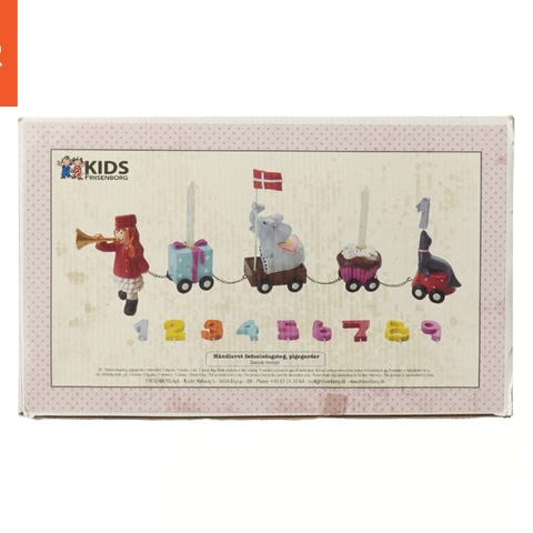 Dette er et håndlavet fødselsdagstog fra Kids by Friis, dansk design. Toget består af flere figurer, der kan forbindes med hinanden. Disse figurer inkluderer en pige, en enhjørning, en fødselsdagskage med plads til lys og en vogn med en dukke. Tallene 0-9 følger med, så togkæden kan tilpasses barnets fødselsdag. Produktet kommer i en beskyttende kasse, der måler 9x24x32 cm.