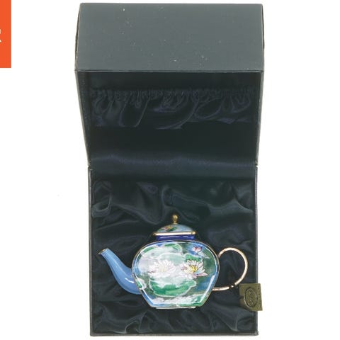 Denne keramiske tekande viser en imponerende og farverig dekoration, inspireret af Gustav Klimts kunstværker. Den har unikke geometriske mønstre og symboler i en række guld, grønne og brunlige nuancer. Tekanden er pakket i en flot sort opbevaringskasse med satinforing, som giver et elegant udtryk. Kassen inkluderer et certifikat, der garanterer autenticiteten af designet, fra Teatime Treasures. Tekanden har dimensionerne 8,5x13 cm.