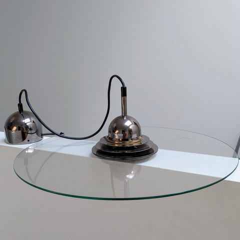 Rund glasplade med diameter på 31,5 cm, beregnet til brug som del af en loftlampe. Glaspladen har et dekorativt mønster rundt i kanten og viser tegn på nogle brune pletter, der kan være skidt eller patina. Lampen omfatter ledninger og monteringsflade i metal til tilslutning til loft. Tags: glasplade, loftlampe.