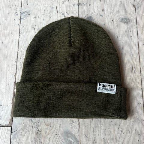 Kær hjemmestrikket hue. Omkreds cirka 50 cm.