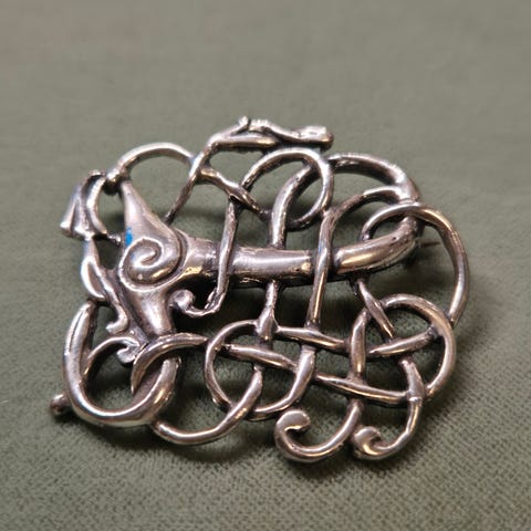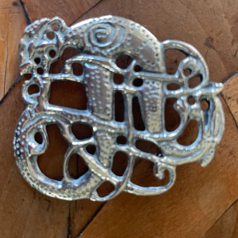 Broche, sølv, Museumssmykker, Dragesmykke, både broche og vedhæng, i sterlingsølv. Aldrig brugt. 4,9 x 5,3 cm. Smuk og elegant kopi af smykke fra vikingetiden fundet ved Roskilde. Originalen findes på Nationalmuseet. I original æske med ledsagende tekst. Nypris 1399,-