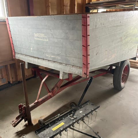 Transportvogn med rødt stel og træbund