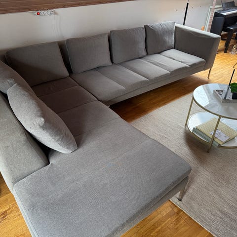 Praktisk hjørnesofa i lys grå. Uldagtigt stof med faste puder.