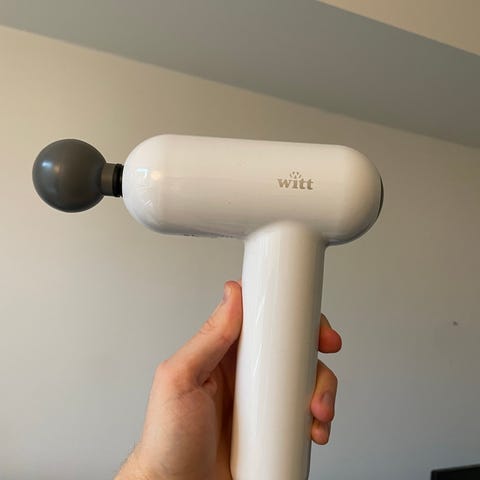 Witt Super Hit massagepistol med 4 udskiftelige hoveder til forskellige massageformål. Enheden har en digital skærm til justering af intensitetsniveauer. Farve: Hvid.