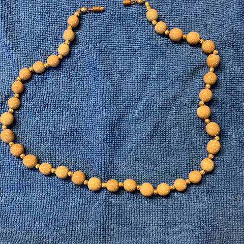 41 cm lang halskæde lavet af træ og 3 stykker metal. Den har en solid skruelås i samme metal som de 3 perler.