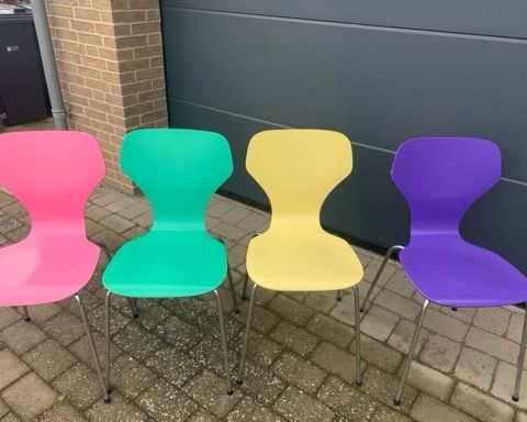 Stolene er oprindeligt blå, men er senere spraymalet sorte.