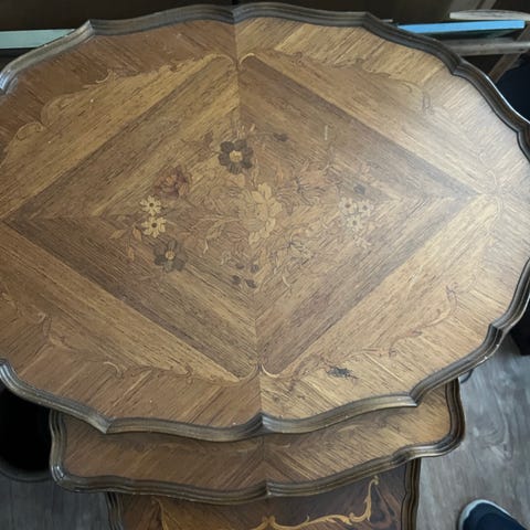 Sæt bestående af tre indskudsborde i rosentræ. Bordene har forskellig størrelse og kan stables under hinanden. Pæn stand.