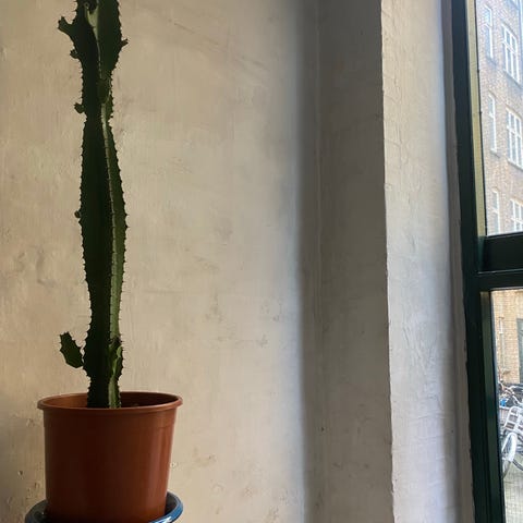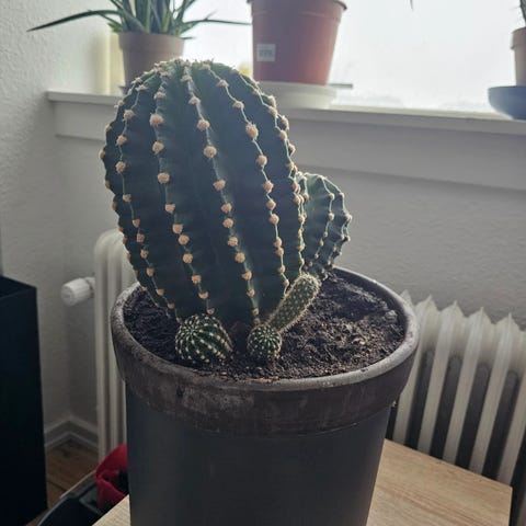 Kaktus med grønne stængler og røde torne. Planten er i en rund terrakottakrukke og velegnet til indendørs brug som dekorativ plante. Kan læse mig frem til at den hedder Echinocactus Grusonii på nettet. Den er helt ny og potten medfølger som er noget tykt plastik. Kostede 500,- fra ny og er fået i gave forleden, men har ikke lige en plads til den. Så den fremstår som ny.