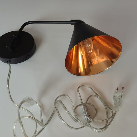Messingfarvet metal. Drejelig arm. Et justerbart lyspunkt. Skærmdiameter ca 15,5 cm. Længde udfoldet ca 75 cm