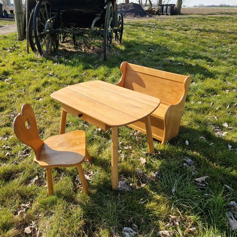 Andre samleobjekter, Retro 70er børnemøbler, Retro børnemøbler - bord, stol og opbevaringskasse fra 70'erne. Lavet af