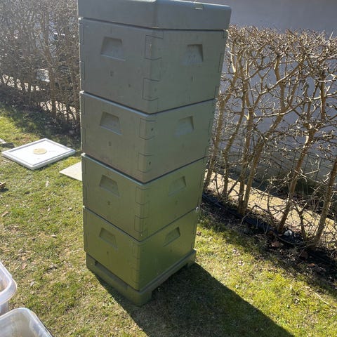 Bi stader, 5 magasiner, bund og låg, 60 rammer med voks og foder trug, lige klar til at bierne flytter ind.