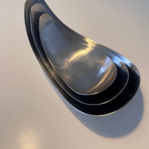 Georg Jensen leaf- dekorationsskåle i rustfrit stål. Sættet indeholder tre skåle med en blank, spejlpoleret overflade. Skålene har en organisk form og kan anvendes til dekoration eller opbevaring af små genstande. Prisen er for alle 3