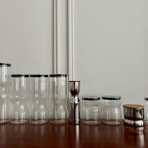 Georg Jensen opbevaringsglas sæt bestående af forskellige beholdere med låg i træ og rustfrit stål.