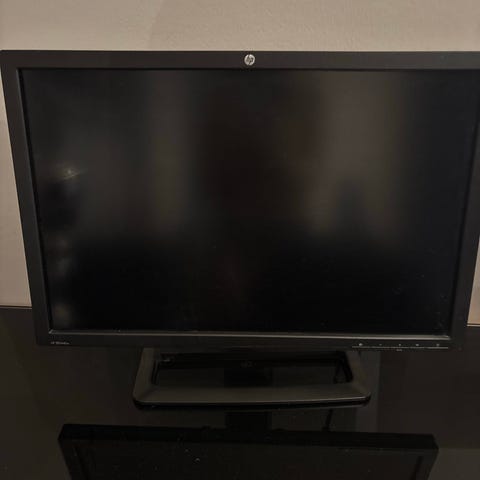 HP 24fw 24" skærm med HDMI og VGA porte. Skærmen har en hvid og sølvfarvet ramme. Skærmstørrelse: 24 tommer.