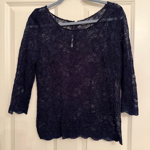Bluse, STASIA, str. 36, Sort, Blonde, God men brugt, Sort blonde bluse fra STASIA med tutle neck, 3/4 lange ærmer og lynlås og lukning i nakken med 2 fine stofbetrukne knapper, så der er et åbning fra selve lynlåsen op til knapperne - fin detalje(se billede 2)