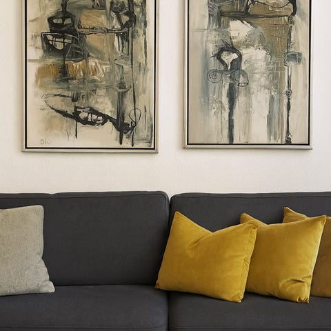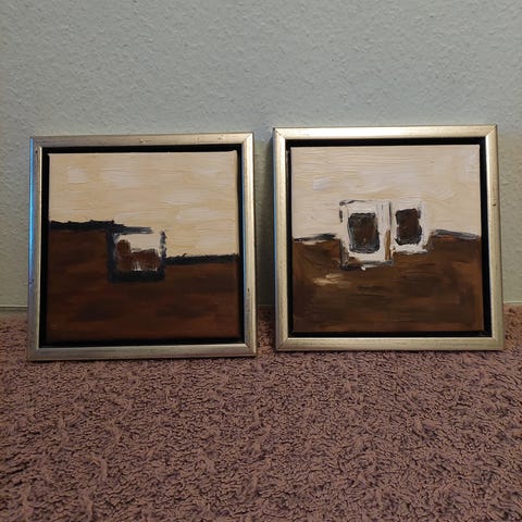 Sæt bestående af to abstrakte malerier med brune, hvide og sorte farver. Malerierne har forskellige motiver inklusive hjerter og tekst Faith' og 'Hope'. Hvert maleri er rektangulært og har en lodret orientering.