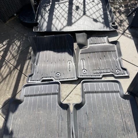 Sæt bestående af 4 gummimåtter til bil. Måtterne er sorte og har en struktureret overflade for at fange snavs og væsker. Designet til at passe til bilens gulv for at beskytte mod snavs og slid.