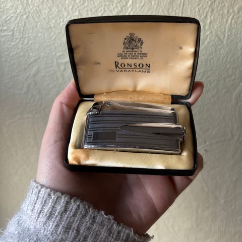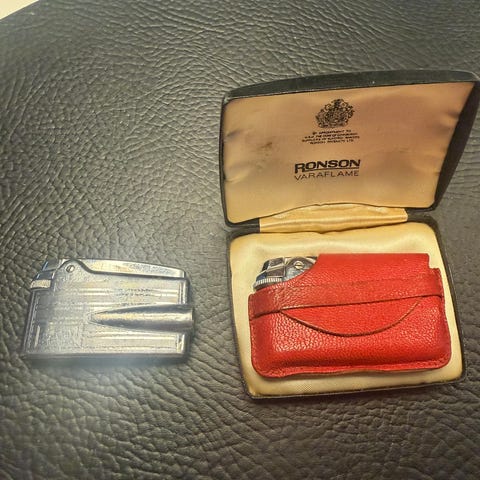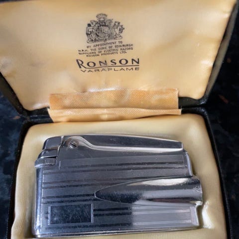 • Stand: Lighteren er i rigtig flot, original stand – kun let patina og brugsspor, ingen dybe ridser. Mekanismen ser intakt ud (god gnist?), og den har den originale æske med “By Appointment to HM The Duke of Edinburgh”-våben (fra perioden, hvor Ronson havde royal warrant).