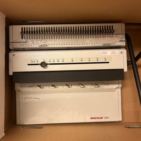 God kraftig maskine til at lave spiralryg indbinding. Der medfølger tilbehør til indbinding af ca. 75 sæt.