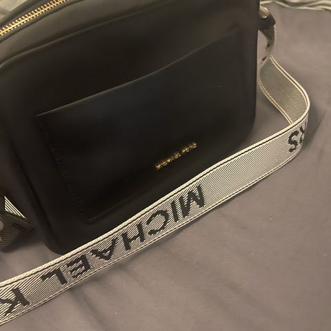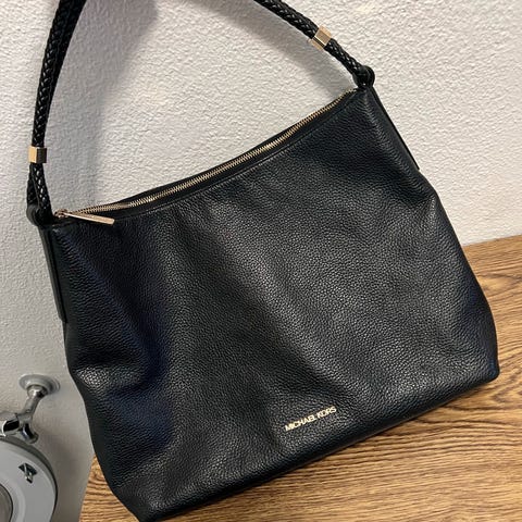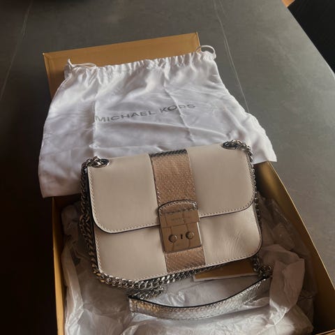 Lækker og elegant Michael Kors skuldertaske, som står som næsten helt ny stand. Brugt maks 10 gange. Bredde er 24,5 cm, højde 13,5 cm og dybde cm. Indrettet praktisk med 6 kortholder, to rum indeni, hvor et af dem er med lynlås. Bagpå er der også et rum, som lukkes med en magnetisk knap. Låsen foran er "MK" logoet, som drejes for at åbne og lukke. Mega smart og ser rigtig fin ud på skulderen.