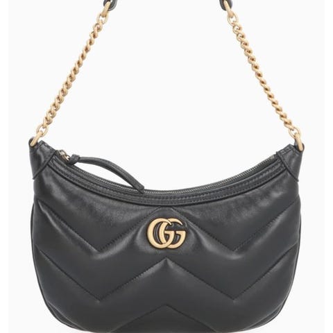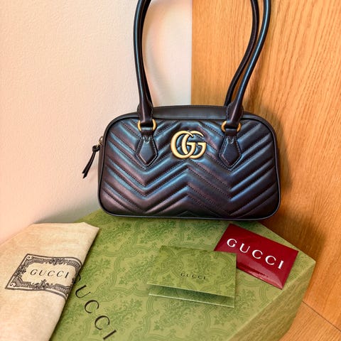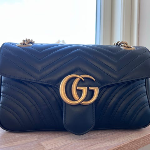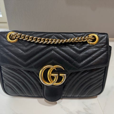 Gucci GG Marmont skuldertaske til kvinde i sort læder. Tasken har en quiltet overflade med det karakteristiske GG-logo i guld på fronten. Den har en kæde- og læderrem til skulderbæring samt en lynlåslomme indvendigt for opbevaring af mindre genstande. Brugt 2-3 gange fremstår derfor som helt ny. Kvittering haves.