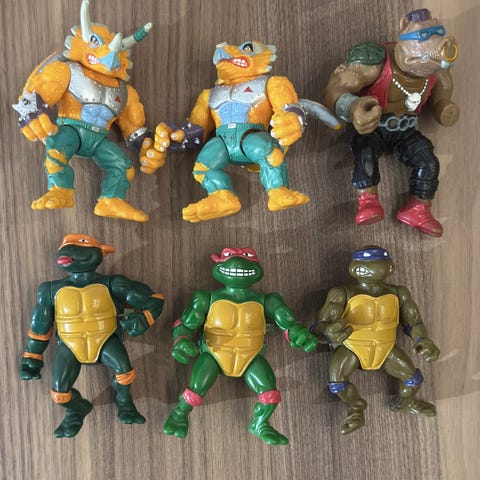 Første udgaver af Rocksteady 1988, Bebop 1988, Leonardo og Donatello 1988 fra Teenage Mutant Ninja Turtles samlet 325 kr. eller 125 kr. stk. Alle figurer har våben.