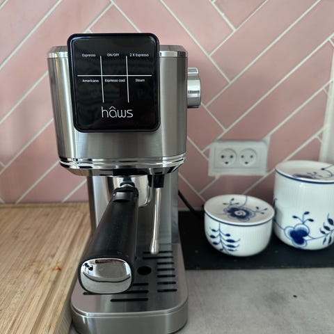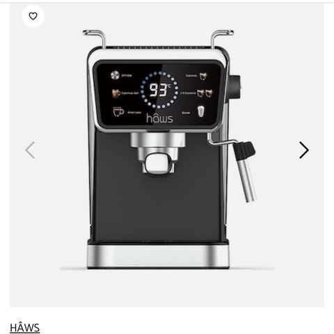 Haws kaffemaskine med en kapacitet på 1,2 liter. Fremstillet i rustfrit stål, velegnet til brygning af espresso og andre kaffedrikke. Maskinen inkluderer funktioner til justering af styrke og damp til mælkeskumning.