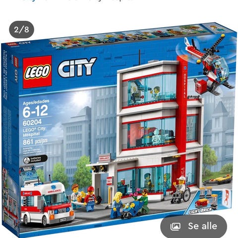LEGO City Hospital bygning med tilhørende figurer. Bygningen har flere etager med vinduer og døre, samt en parkeringsplads eller indkørsel. Inkluderer en ambulance og fem forskellige LEGO minifigurer. Ny pris 899kroner