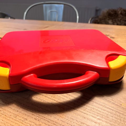Kuffert har lidt ridser og nogle af klodserne lidt misfarvede. Rigtigt godt begyndersæt.