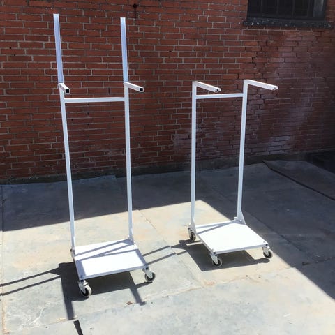 Vippe Sorteringsstation med hvid metalstel. Stationen er udstyret med hjul for nem mobilitet og har en topplade, der kan åbnes. Designet til affaldssortering eller opbevaring.
