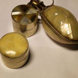 Messing, sødetablet beholder, lille fin messing beholder til sødetabletter med perler og lille pinchet. kr. 75,-