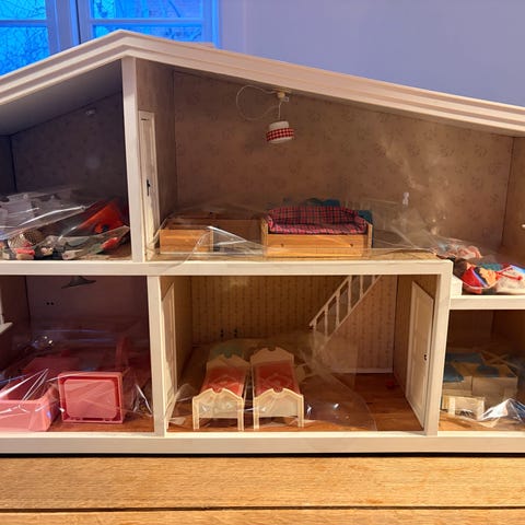 Dukkehuset er let og i fin stand. Der er kun et enkelt sted, hvor gulvet i dukkehuset er slidt (ses på sidste billede). De lyserøde dukke møbler følger med.
