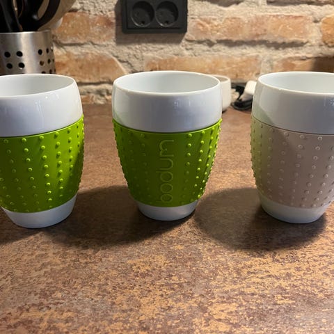 Bodum kaffekrus i hvid porcelæn, sælges som sæt med 2 stk. Krusene har et klassisk design og er velegnede til servering af kaffe. Er uden ridser osv. De er nummereret med nr 16 i bunden. Prisen er 35 kr. stk.