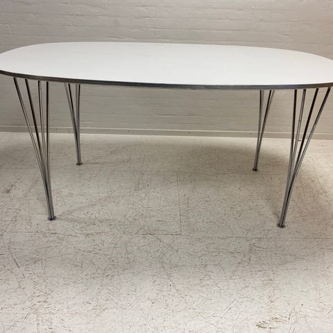 Piet hein spisebord i sort linoleum med alu kant og stål spænde ben . Det er en gamle model da der ikk bliver lavet med sort linoleum mål 180 ×120 høj 72 med 2 tilægs plader et det 300cm der er et hak i bordpladen og et tryk i alu kant . Kom med et bud
