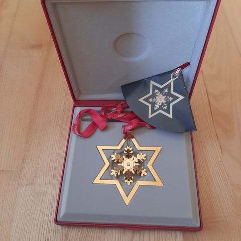 Georg Jensen juleuro 1985, plated med 24 karat guld, årstal 1985 stemplet i uroen, med Cubic Zircon stjernen, med rødt årsbånd, rød æske og indlægsseddel. Bemærk venligst at indlægssedlen er på tysk og engelsk. Det mørke på billede 2 på det ene rensdyr er genskin fra camera. UBRUGT (ikke ryger).