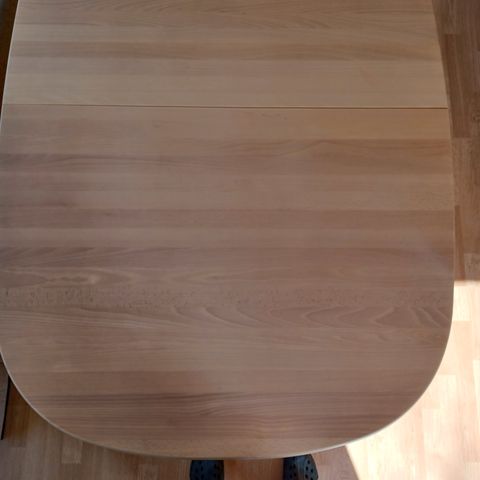 Der er lidt farveforskel på den midterste bordplade og de yderste, når bordet forlænges. Der er mindre slidmærker i bordpladen.